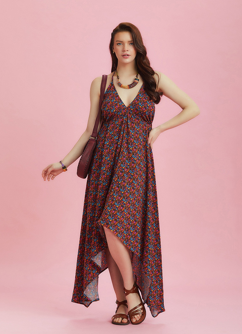 Adjustable Straps, Deep V Neckline, Loose Fit, Open Back Detailed, Hanky Hem Long Dress
