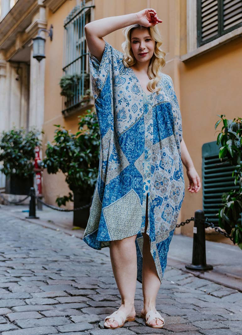 Blue Print Bohemian Style V Neck Cold Shoulder Plus Size Dress
