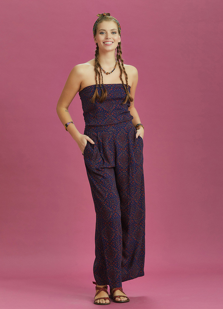 Sash Tie Back Closure, Elastic Waist, Side Pockets, Wide Leg, Strapless Overall