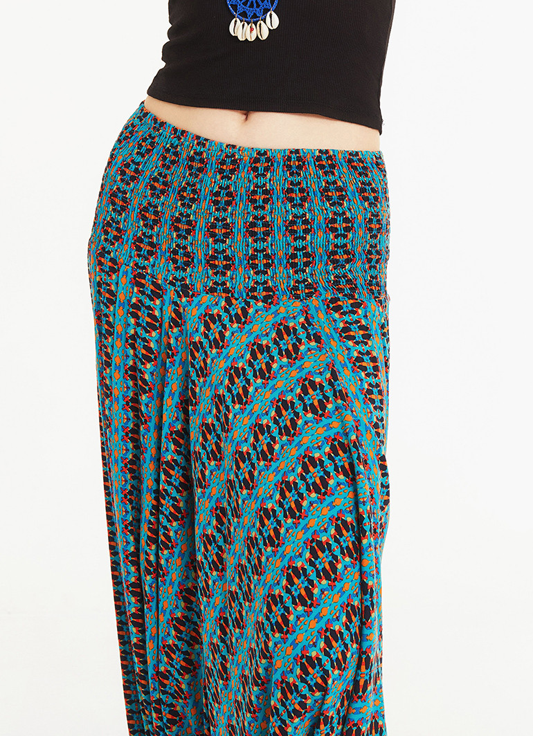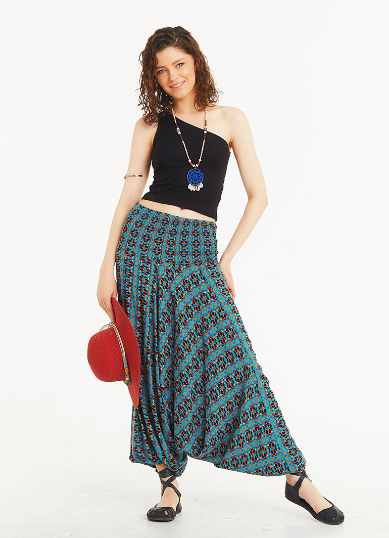 Blue Print Wide Shirred Waist Boho Style Harem Pants