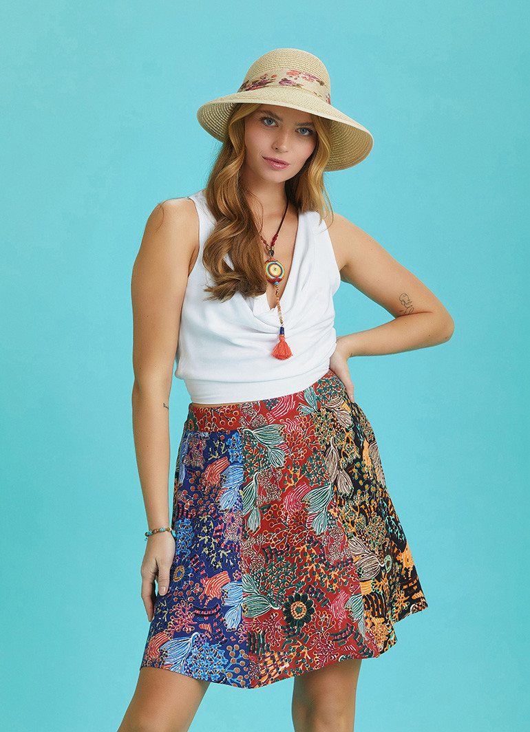 Easy Pull-On Elastic Waist, Flared, Patchwork Mini Skirt