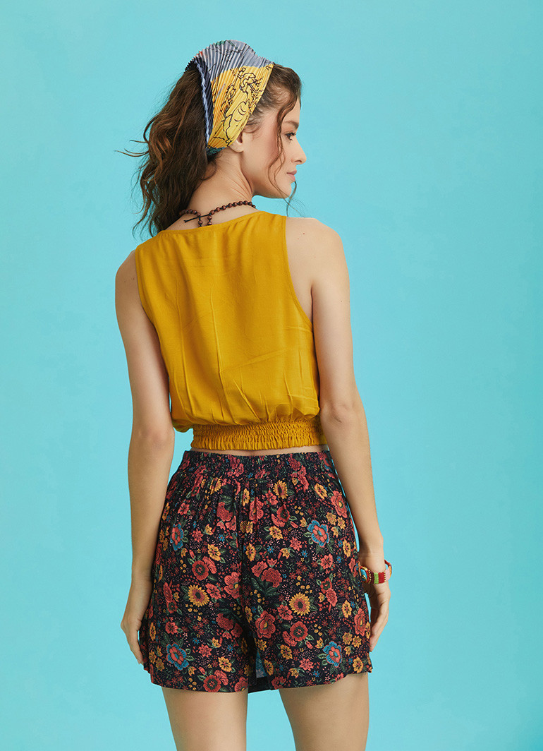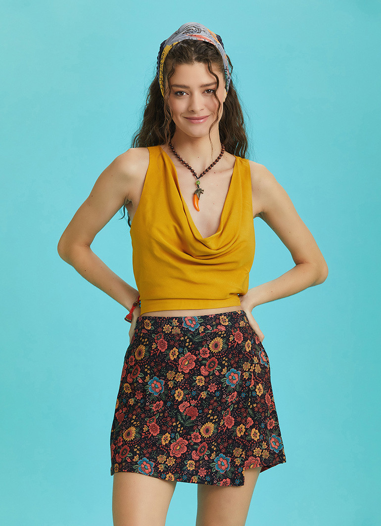 100% woven viscose. It is a fabric woven from natural cellulose obtained from beech trees. It is very light and flowy. It does not contain polyester and does not make you sweat. You can wash it in the washing machine at 30 degrees.