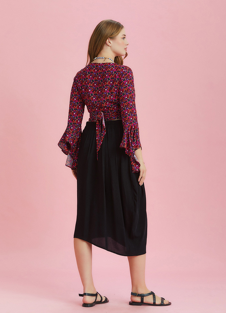 100% woven viscose. It is a fabric woven from natural cellulose obtained from beech trees. It is very light and flowy. It does not contain polyester and does not make you sweat. You can wash it in the washing machine at 30 degrees.
