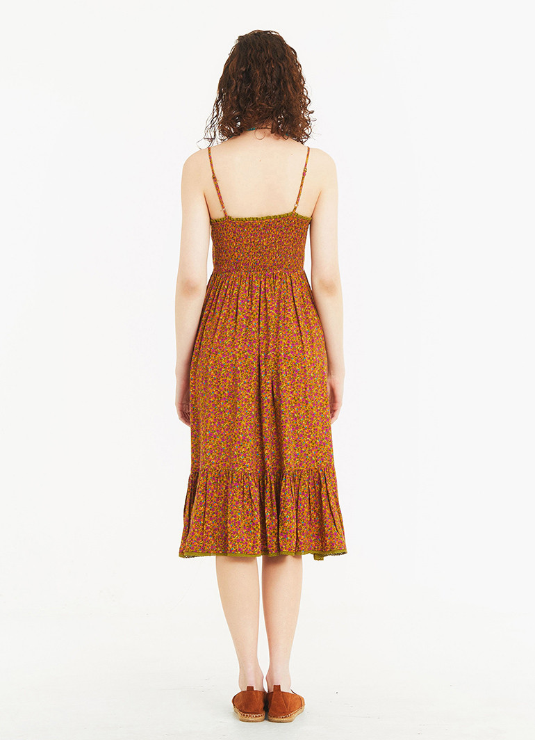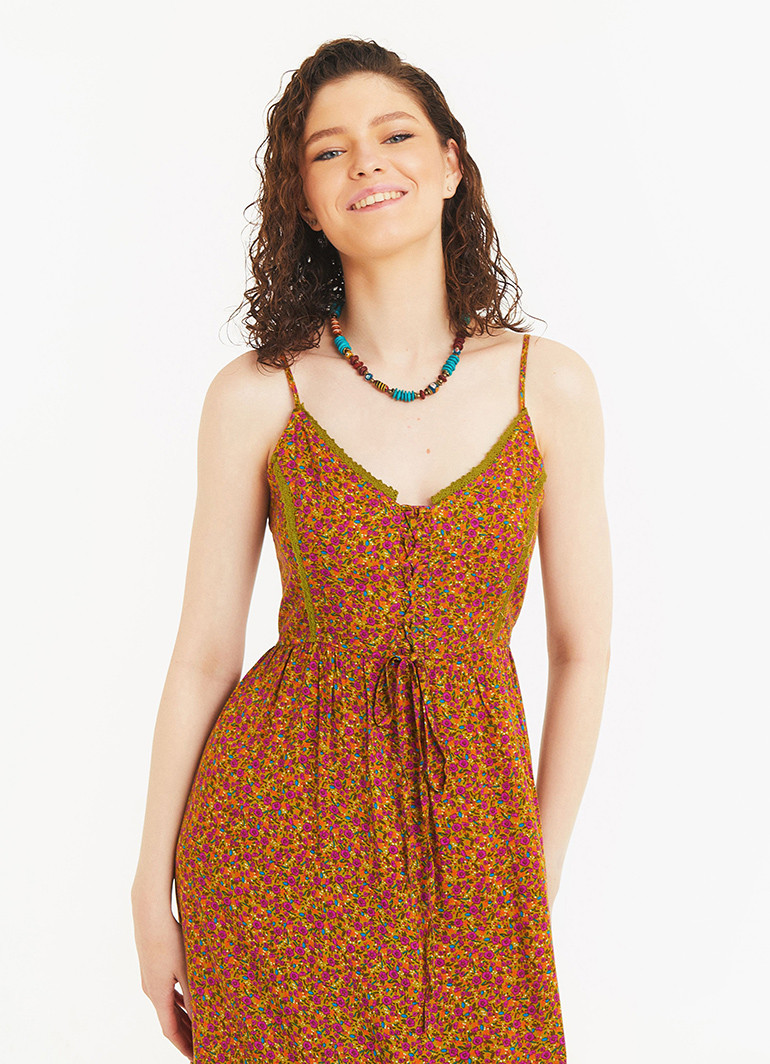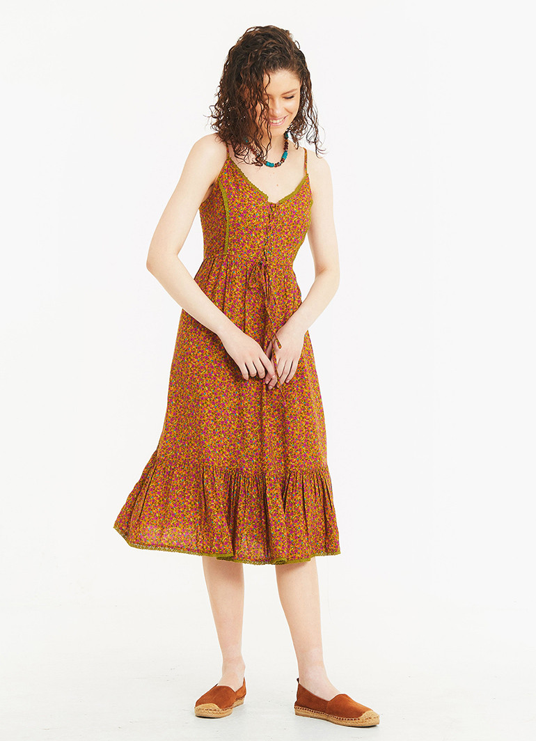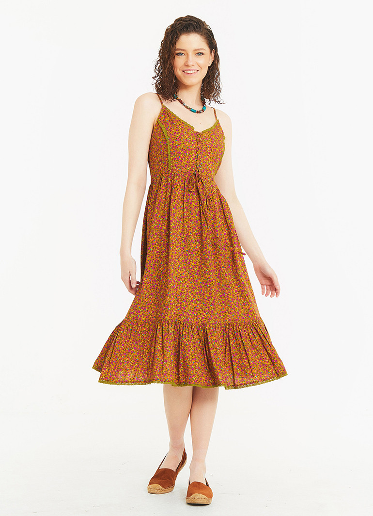 Criss Cross Detail Neckline, Ruffle Hem, Shirred Back, Strappy, Laced, Flowy Dress