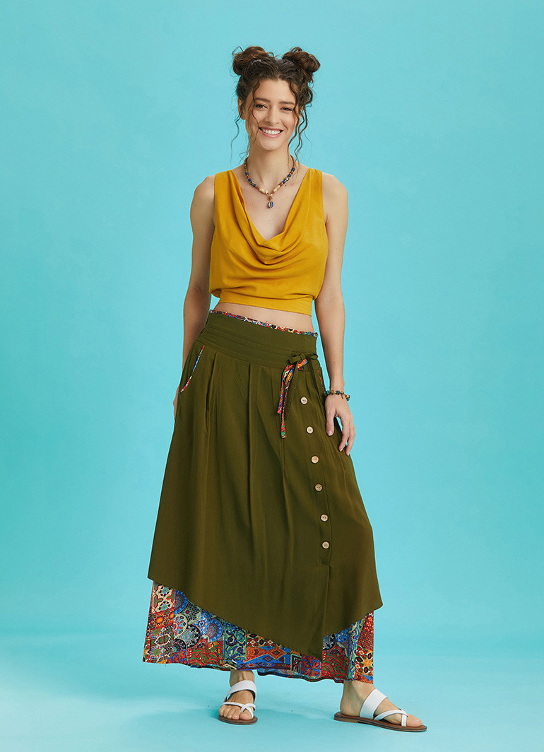 Elastic Waistband, Side Pockets, Drawstring Tie, Double Layered Maxi Skirt