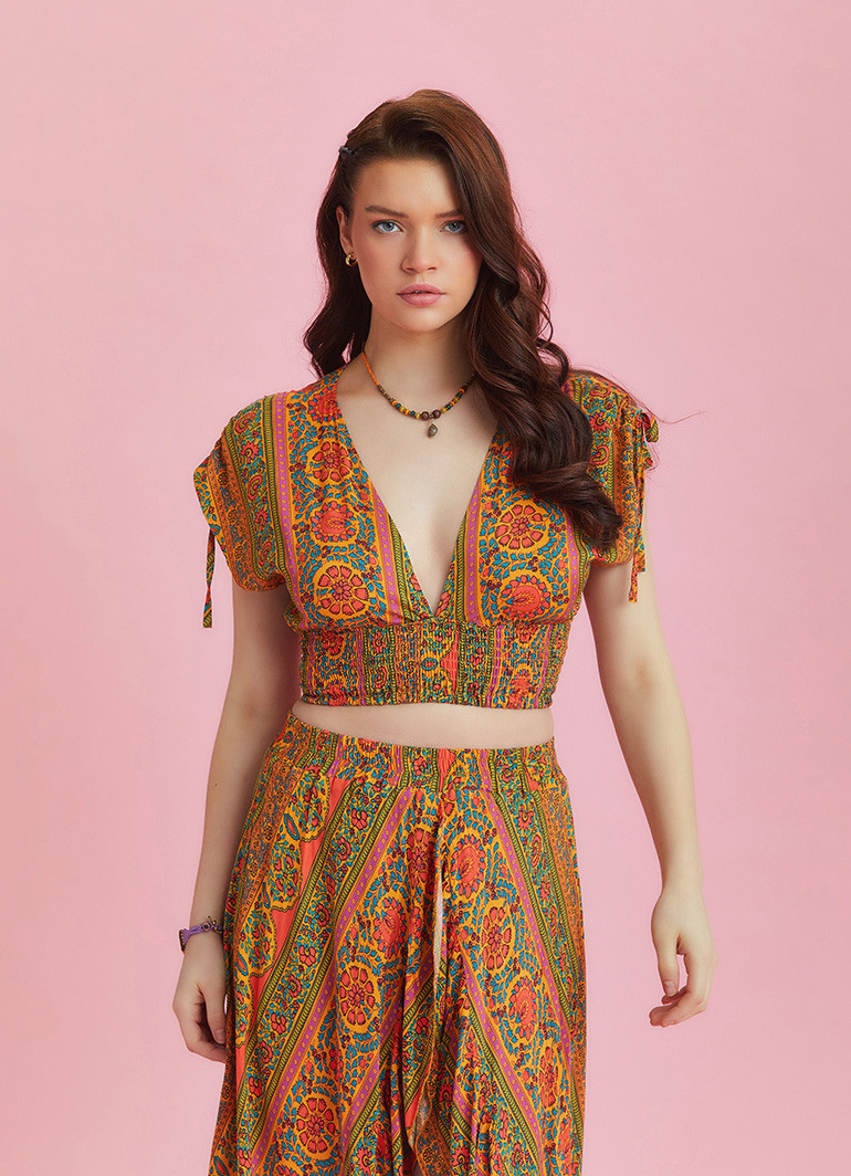 Drawstring Detail Raglan Sleeves, Shirred Hem, Deep V Neckline Top