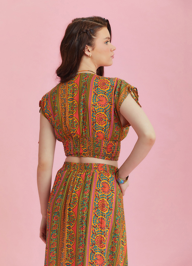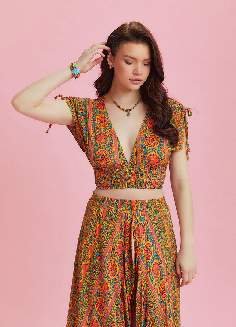 100% woven viscose. It is a fabric woven from natural cellulose obtained from beech trees. It is very light and flowy. It does not contain polyester and does not make you sweat. You can wash it in the washing machine at 30 degrees.