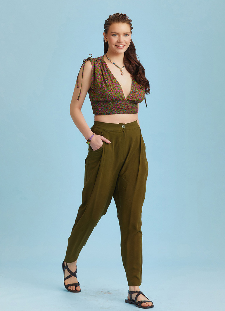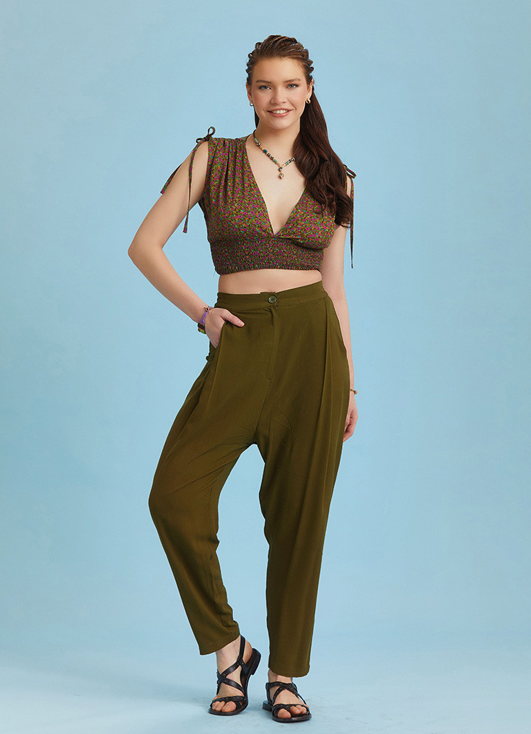 Front Pleat Detail, Elastic Back Flat Front Waisband, Pockets, Drop Crotch Pants