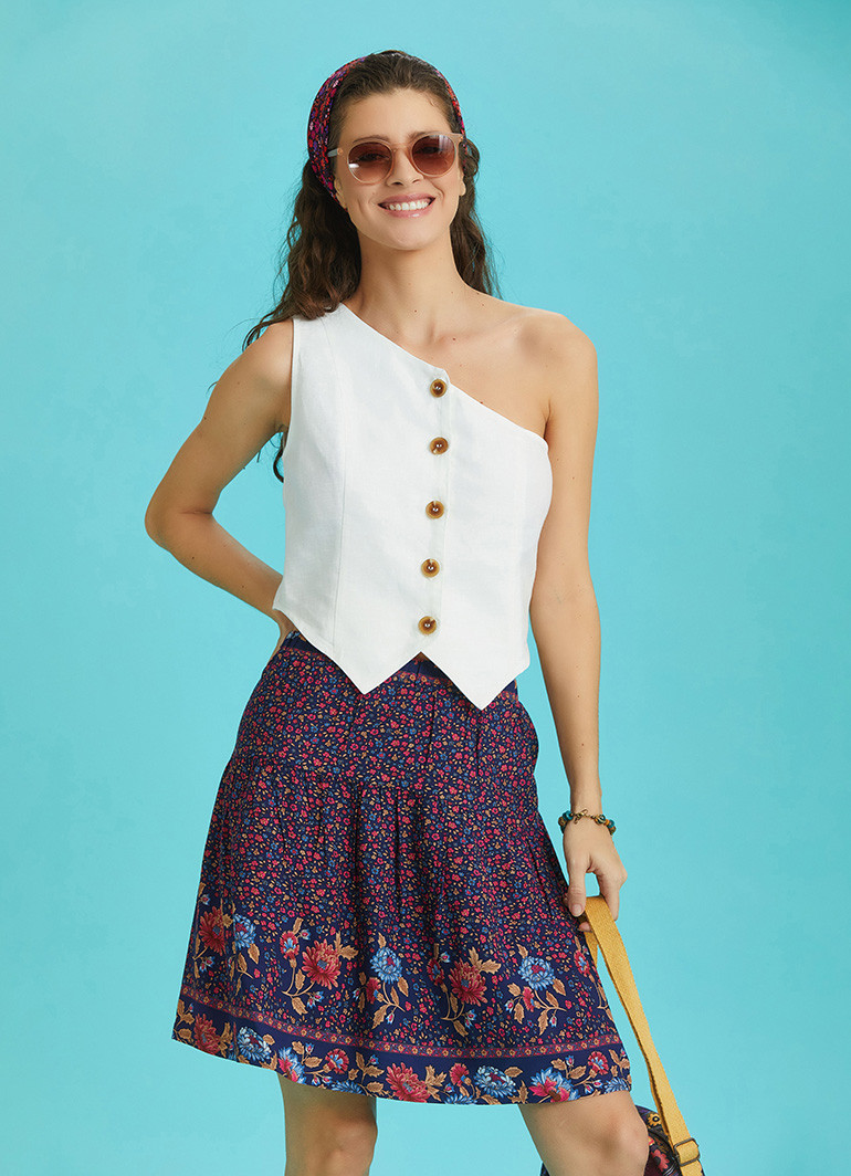 100% woven viscose. It is a fabric woven from natural cellulose obtained from beech trees. It is very light and flowy. It does not contain polyester and does not make you sweat. You can wash it in the washing machine at 30 degrees.