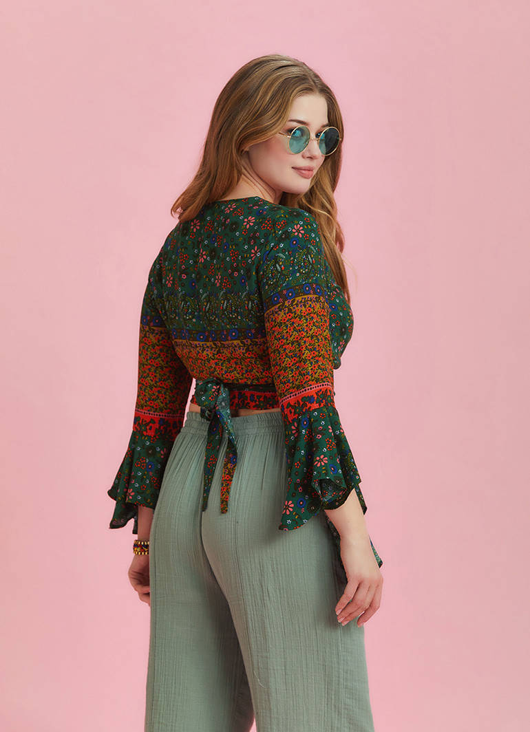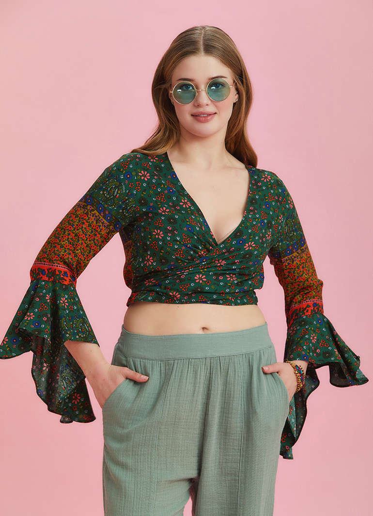 V Neckline, Long Bell Sleeve, Gypsy Style, Wrap Around Crop Top