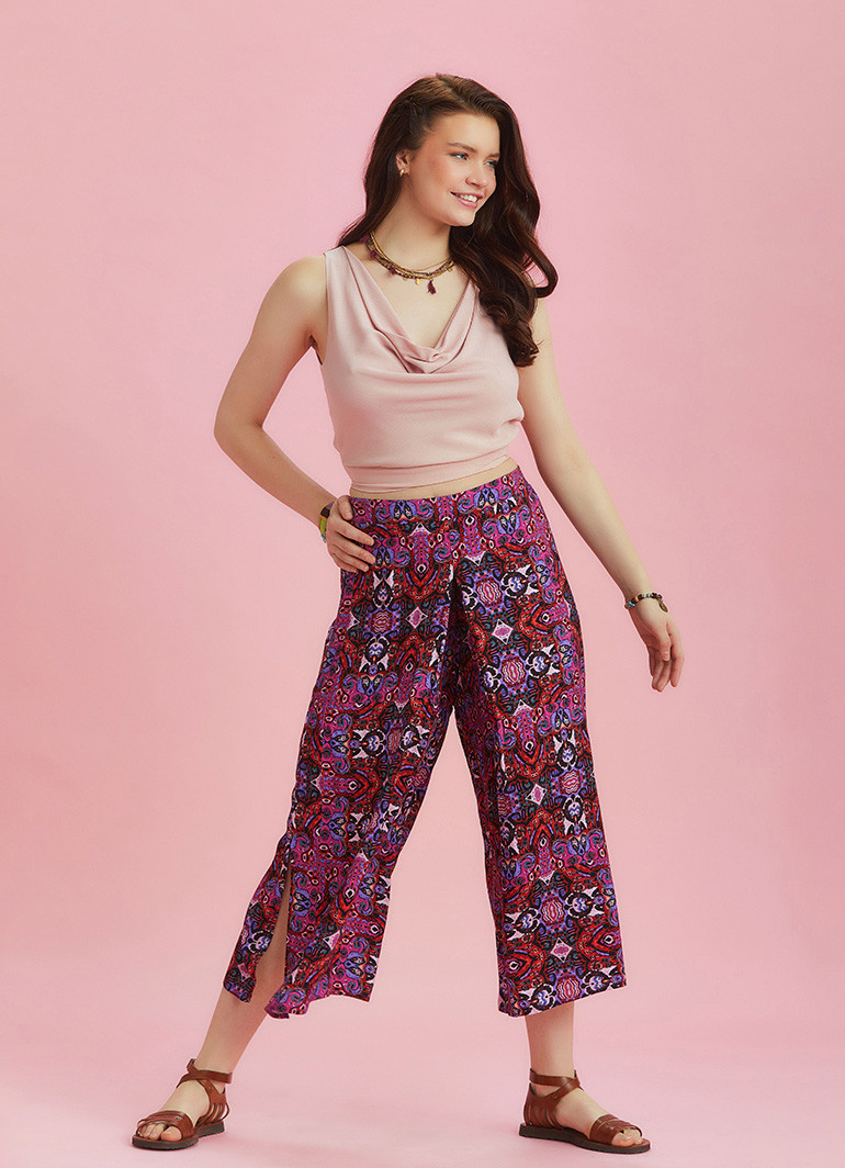 Ethnic Patterned, Bohemian Style, Front Pilikaşe and Side Tear Detail, Rear Waist Elastic, Pocket, Capri Oversized, Draped, Authentic Women's Pants Skirt.