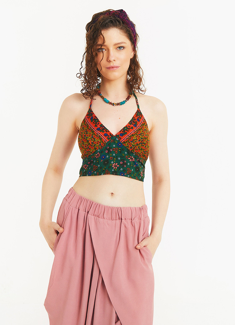 Gathered Tie Back Bust Cup Halter Flowers Crop Top