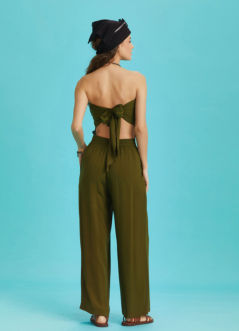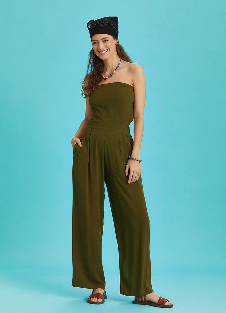 Khaki Wide Leg Strapless Overall
