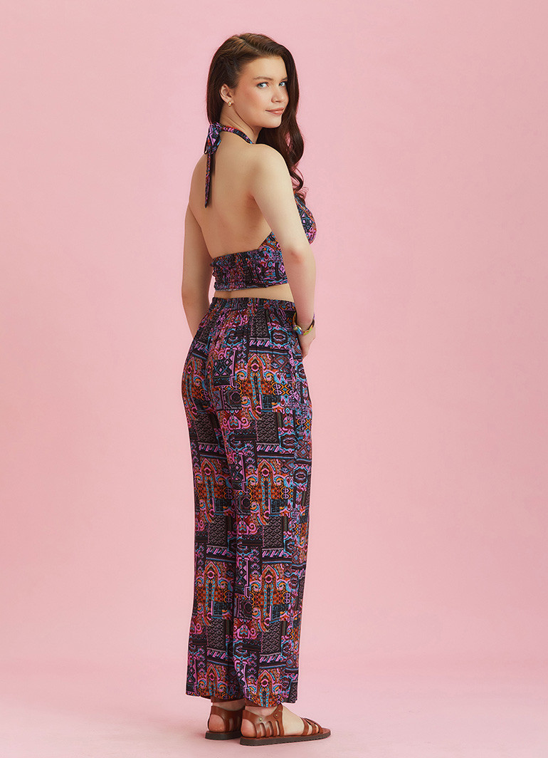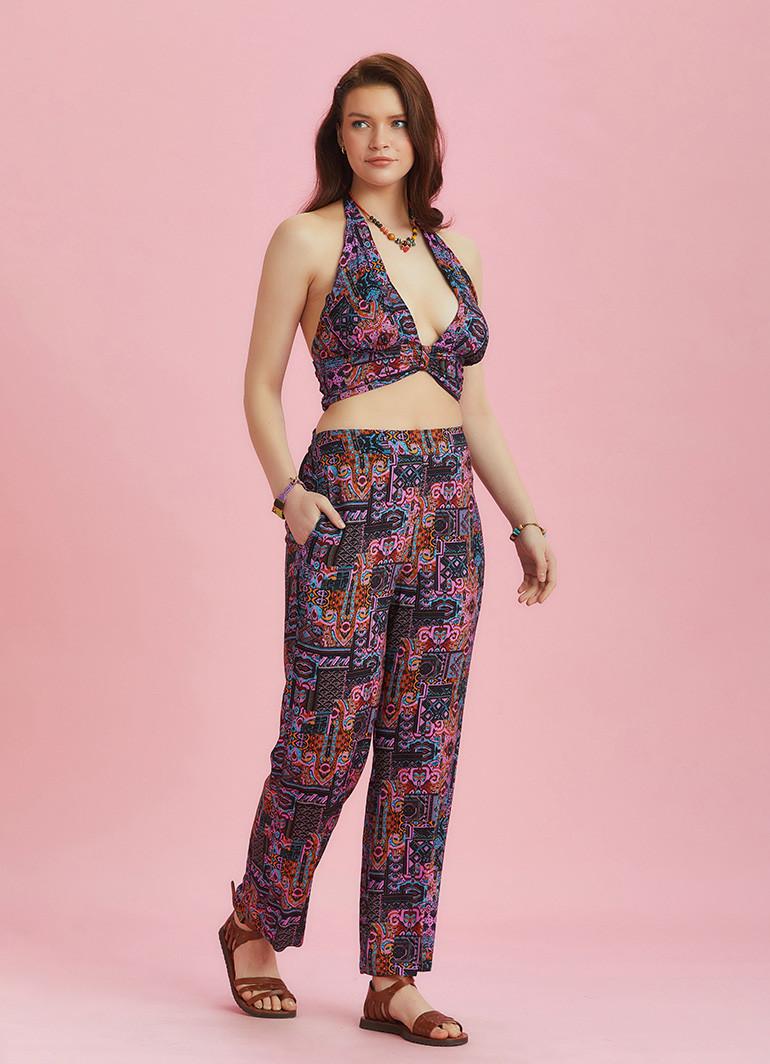 Flat Front Elastic Waistband, Side Pockets, Ankle Length, Printed Pants