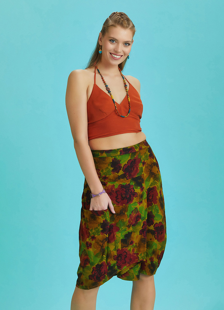 Oversize Pocket Detail Wrap Front Midi Khaki Boho Skirt
