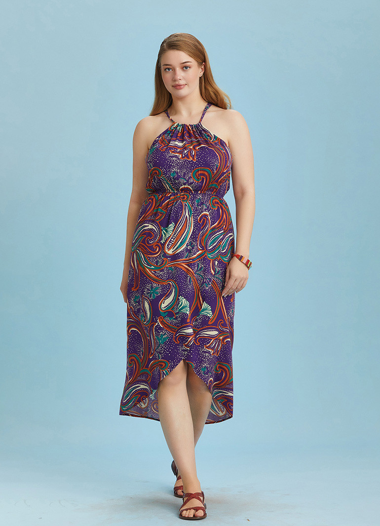 Ethnic Pattern, Bohemian Style, Dip Hem, Elastic Waist, Halter Neck, Half Lined, Authentic Women's Evening Plus Size Dress
