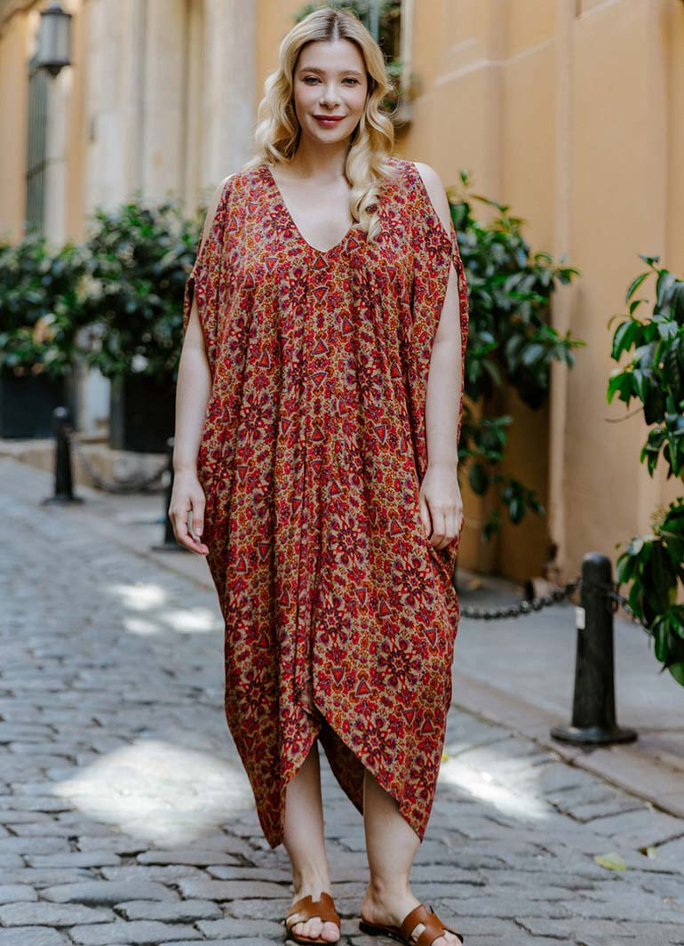 Red Print Bohemian Style V Neck Cold Shoulder Plus Size Dress