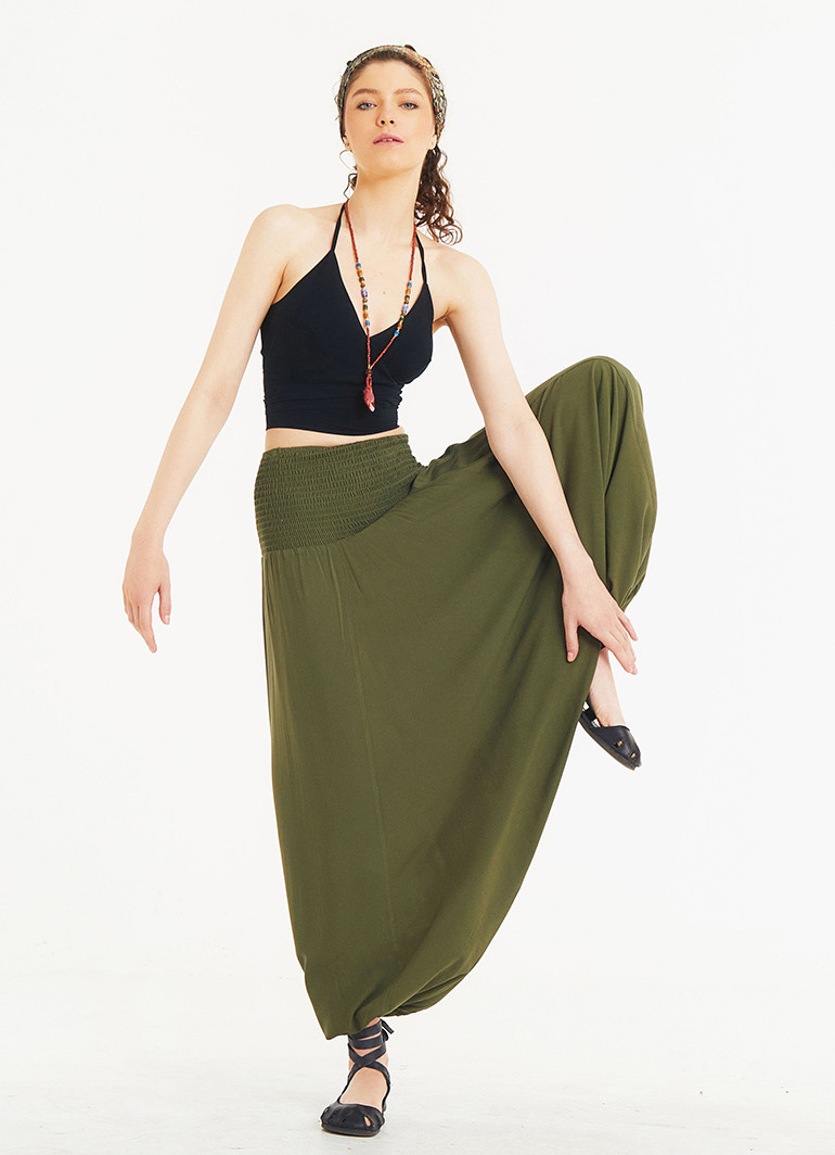 Shirred Waistband, Elastic Hem, Khaki Harem Pants