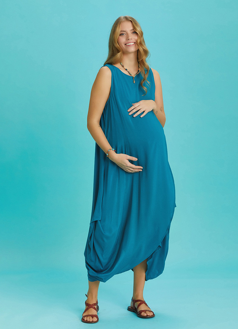 Sleeveless Front Layered Blue Baggy Maternity Dress