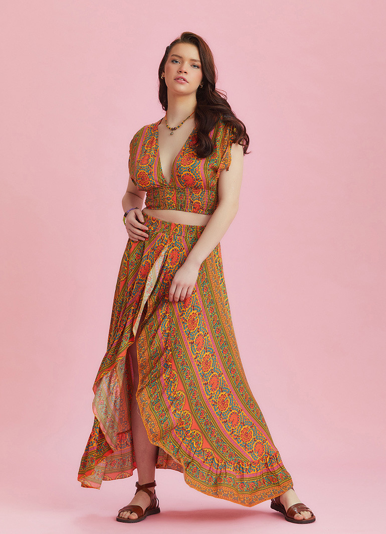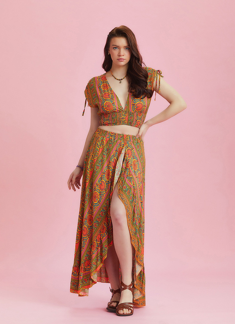 Split Front Frill Hem Orange Print Long Gypsy Skirt