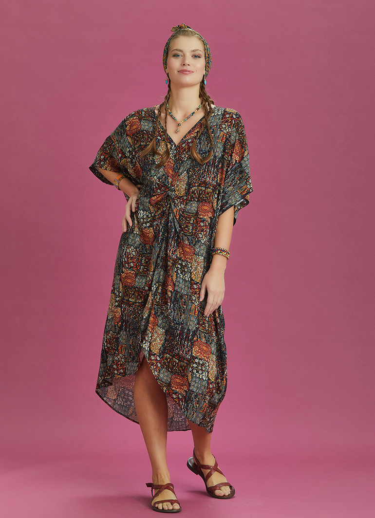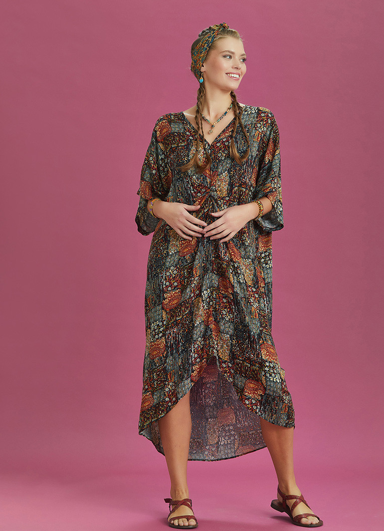 V Neckline, Twist Front Detail, Loose Fit, Half Bat Sleeves, Long Dress
