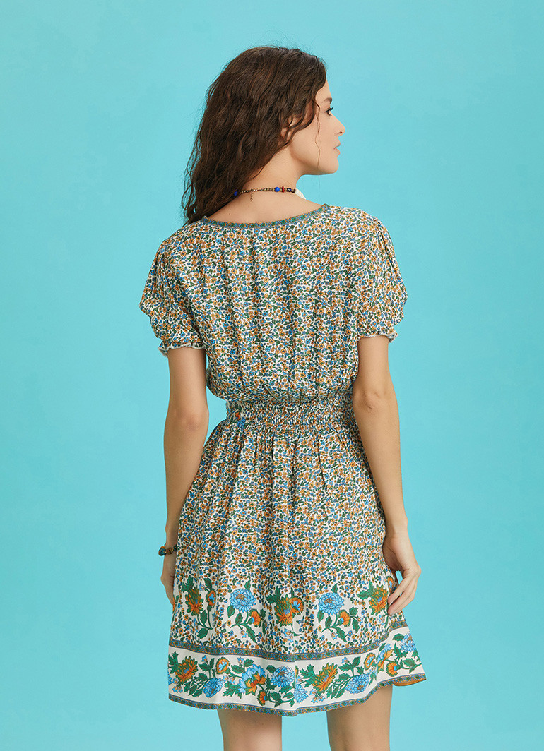 V Neckline, Button Details, Shirred Elastic Waistband, Half Puff Sleeves, Short Dress
